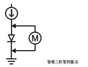 二极管采用如下图所示之顺向电压测量法,来辨别二极管的好坏,正常的硅 ( Silicon )二极管之顺向电压约为0.7V,而锗 ( Germanium )二极管之顺向电压约为0.3V。