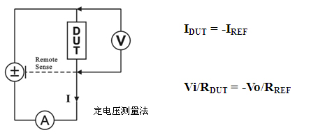 如下图所示,为被使用测量大电阻的测量法,乃是应用欧姆定律 ( Ohm’s Law ):R = V / I,提供定电流源至待测电阻,再由其两端所量测之电压值,来计算待测电阻之阻值。 定电流/电压测量法